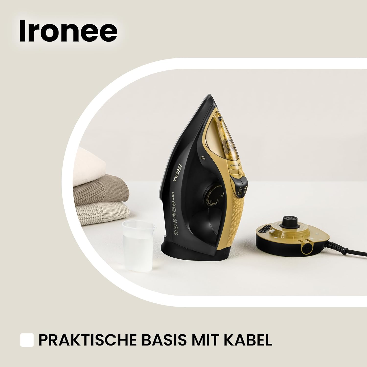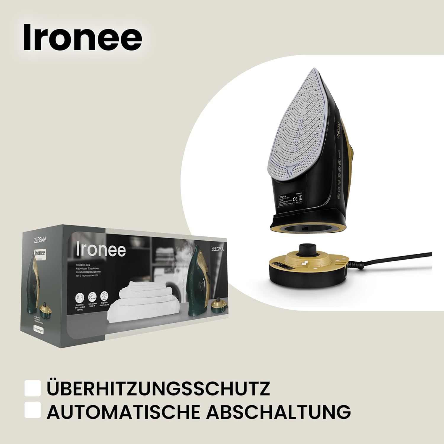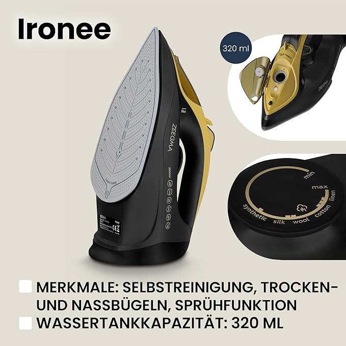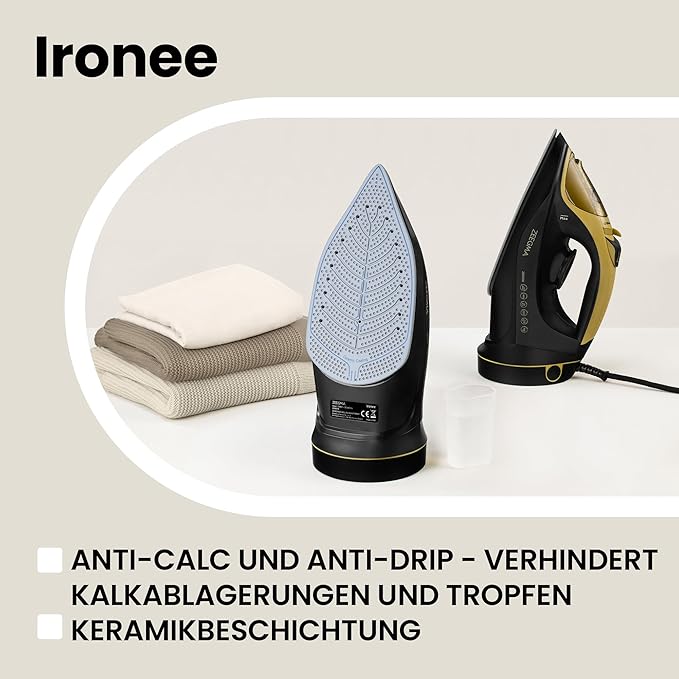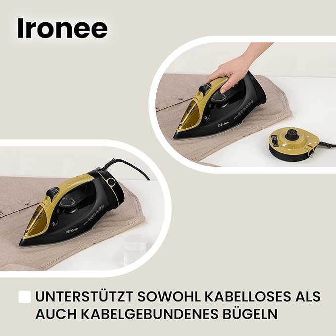 • Безжична ютия: благодарение на мощността от 2600 W, моделът Ironee е изключително ефективен и се загрява бързо. Подметката на ютията е снабдена с керамично покритие и по този начин гарантира копринено гладко гладене без гънки. Благодарение на парата от 30 г/мин, е възможно и вертикално гладене с пара.