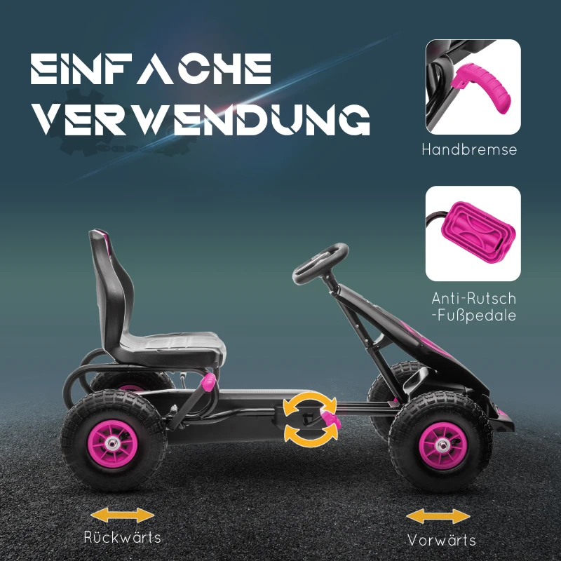 - Лесна за употреба: С ръчна спирачка и волан, управлението на тази кола с педали е лесно и без усилие, независимо дали искате да се движите напред, назад или да спрете.