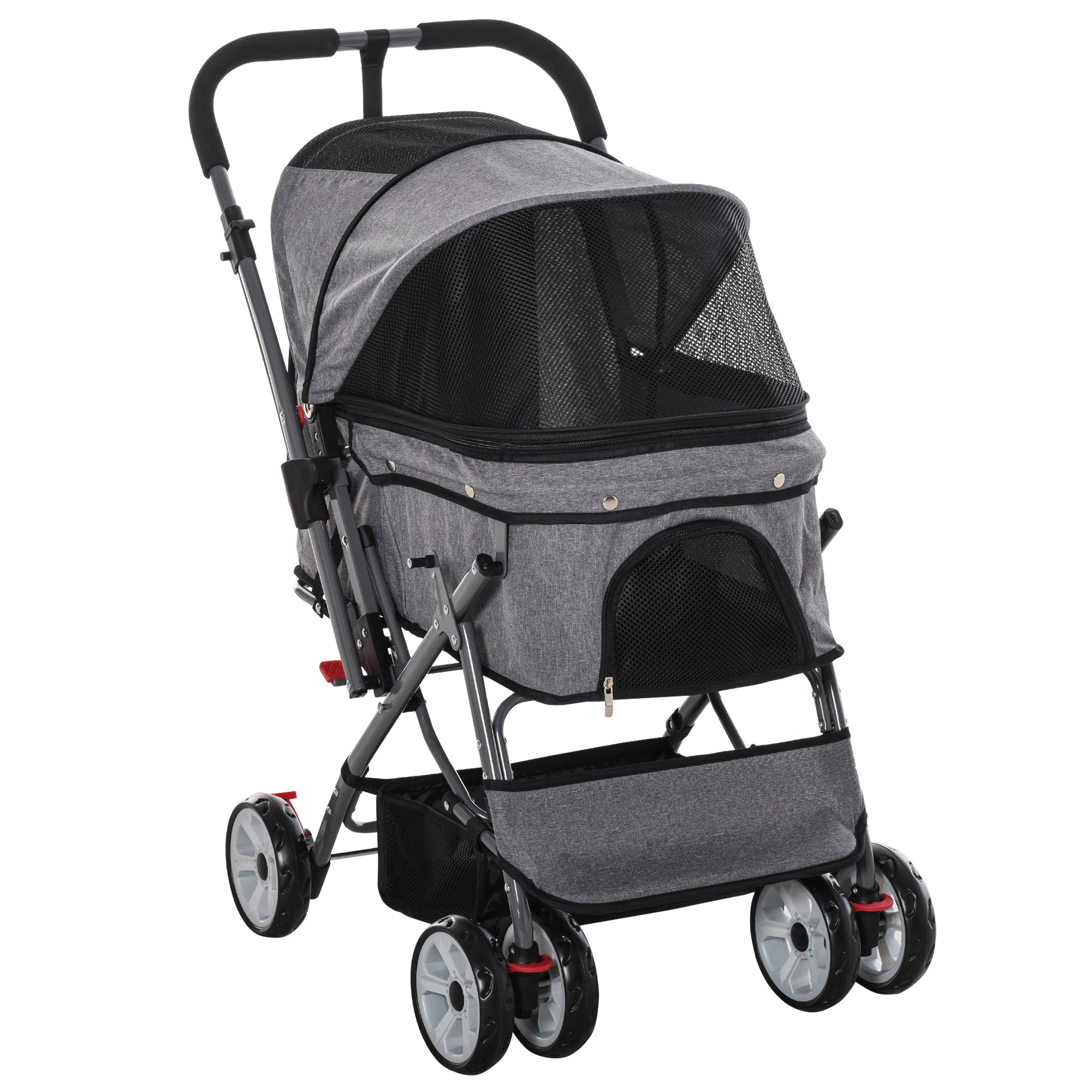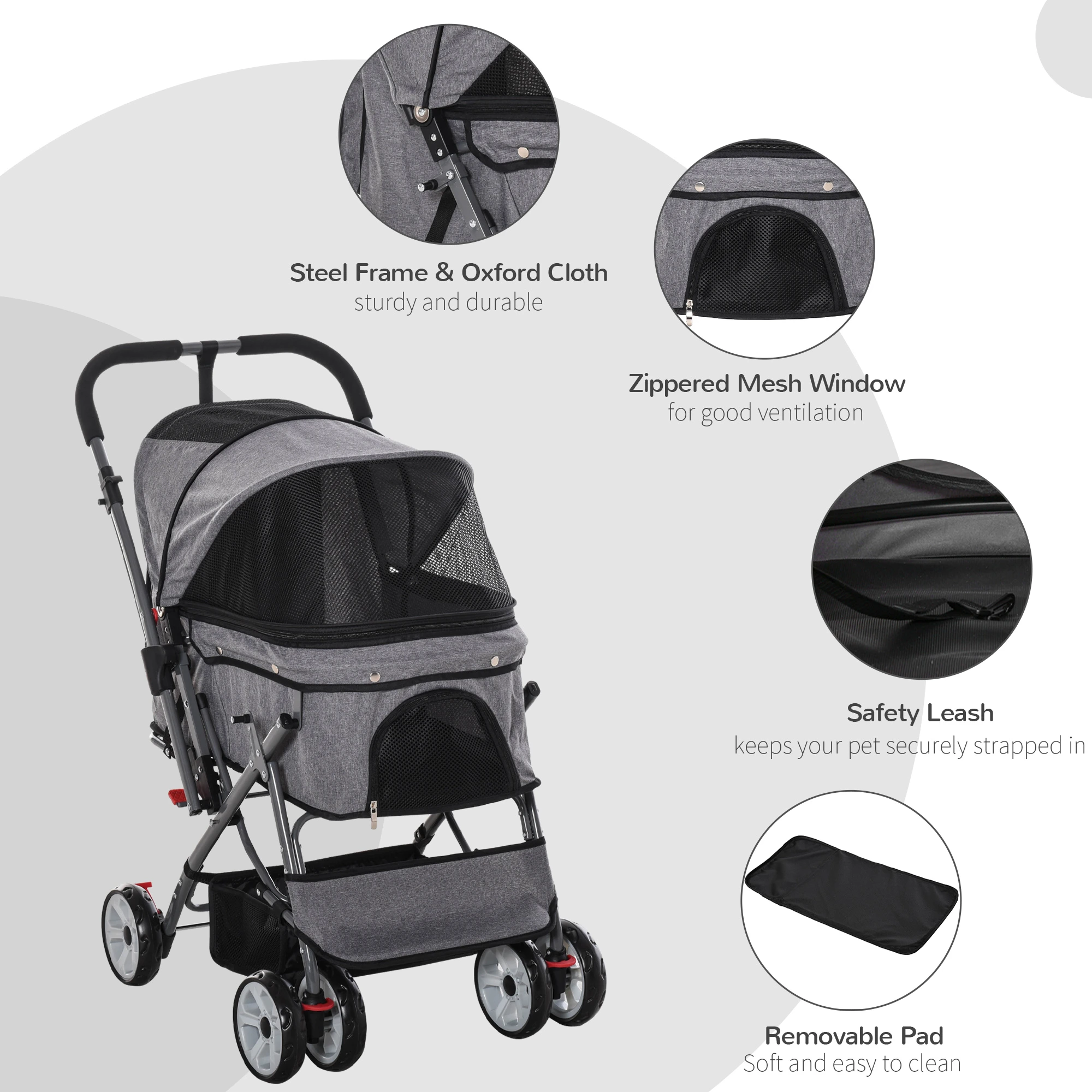 Сгъваема количка за куче/котка с обръщаща се дръжка EVA колела Спирачки Чанта за съхранение, 3-степенен сенник, мрежеста врата на прозореца с цип, сива