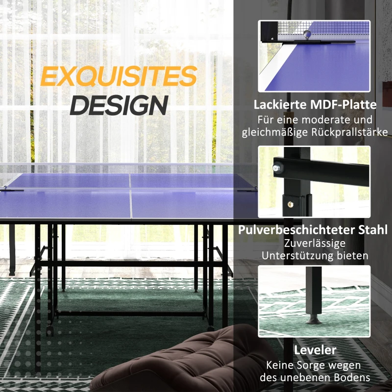 - Изискан дизайн за плавно игрално изживяване: Масата за тенис на маса е изработена от висококачествен MDF и е поддържана от здрава, прахово боядисана стоманена рамка. Благодарение на регулируемите крачета е гарантирана равна игрална повърхност – за плавна и чиста игра. Забележка: Този продукт не трябва да се излага на дъжд или слънце. Препоръчва се за употреба на закрито.