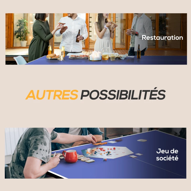 - Многофункционален дизайн: Трансформирайте масата за тенис на маса в просторна маса за хранене на открито, като премахнете мрежата, или сгънете едната половина, за да създадете място за съхранение на вашите гости.