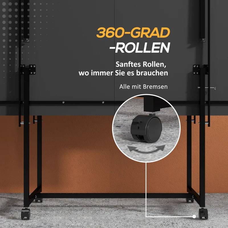 - Компактна и преносима: Масата за тенис на маса може да се сгъва, за да спести място, когато е необходимо, и разполага с четири колела със спирачки, което я прави лесна за преместване навсякъде. Предпазните заключващи механизми на рамката гарантират, че тя остава сгъната, така че краката да не пречат по време на транспортиране.