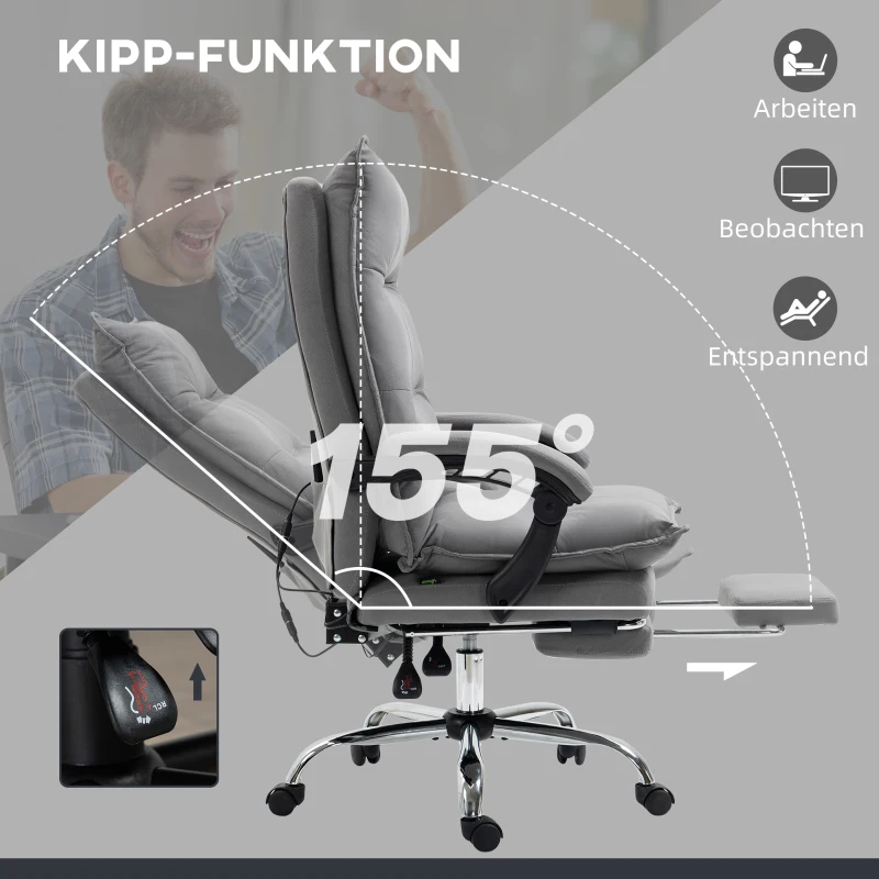 Офис стол Vinsetto с функция за масаж, функция за отопление, дистанционно управление, разтегателна поставка за крака, накланящ се, сив