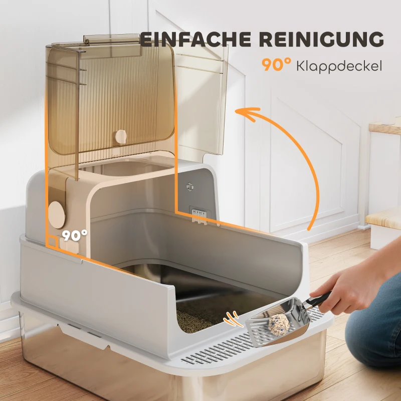 - По-лесно почистване: Предният капак с панти, отварящи се на 90°, на тази тоалетна от неръждаема стомана позволява бързо и лесно почистване. Предният филтърен панел улавя котешката тоалетна от лапите, а предоставената лъжичка за тоалетна улеснява почистването.