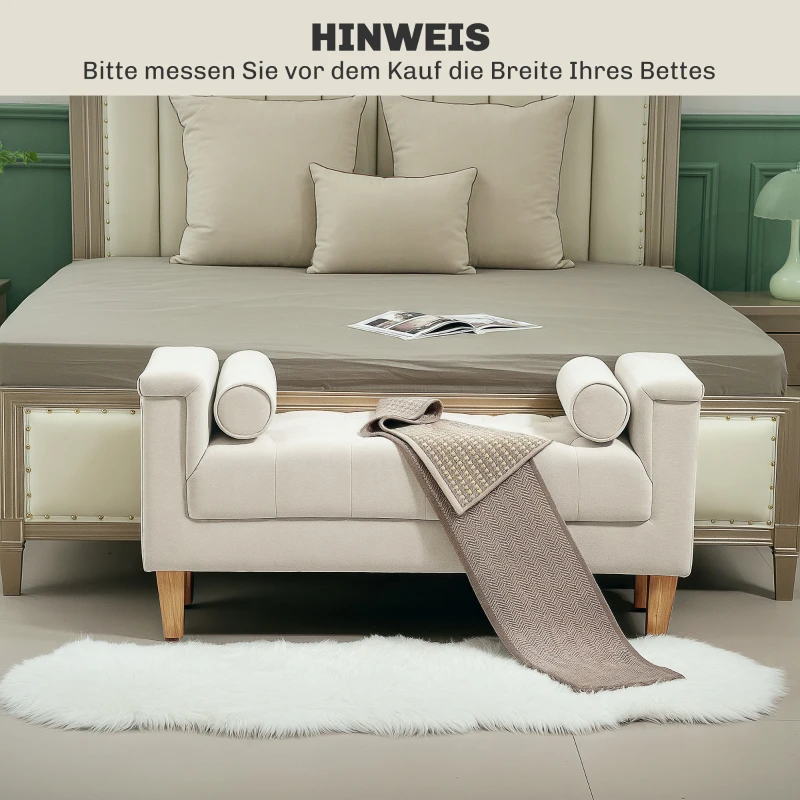 - Многофункционална употреба: Независимо дали като пейка за легло, пейка за връзване на обувки или като пейка за сядане на гости – тази пейка допълва всяка стая и се вписва в различни интериорни стилове.