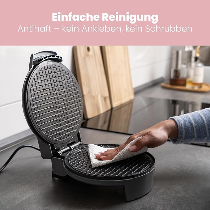 - Безопасен за употреба: кръглият гофретник е с вградена защита от прегряване и топлоизолирана дръжка, а 4-те гумирани крачета осигуряват стабилна стойка.