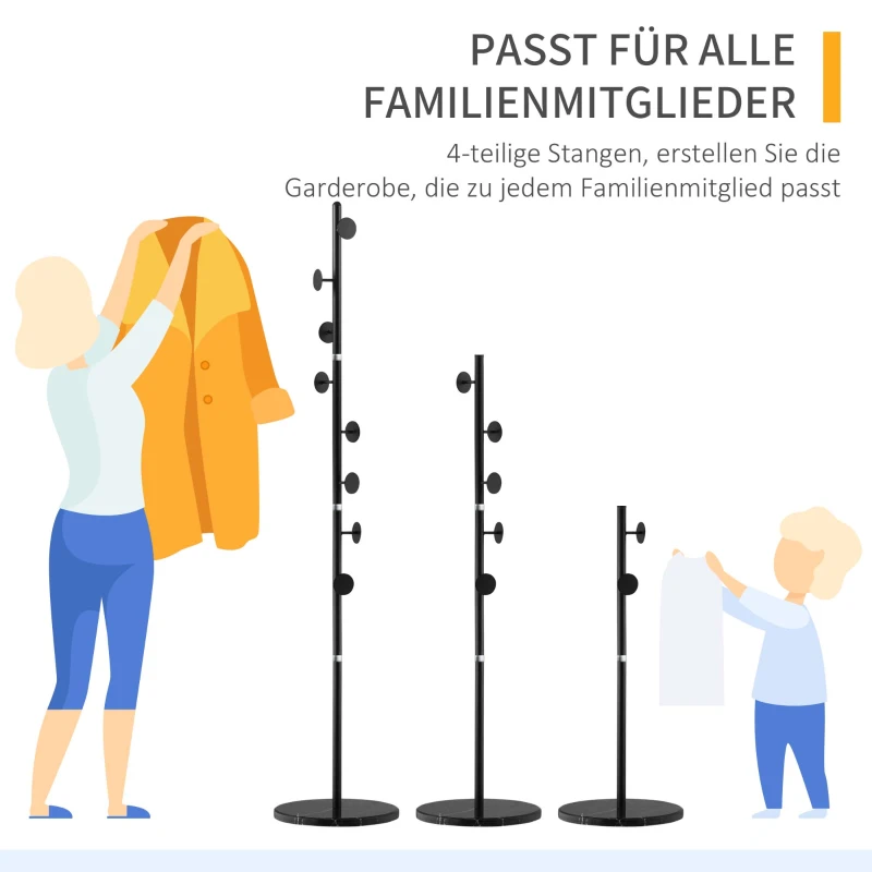 - Регулируема височина за цялото семейство: Тази закачалка за дрехи може лесно да се регулира на желаната височина между 56 и 170 см благодарение на четирите си отделни пръта, идеални за възрастни и деца.